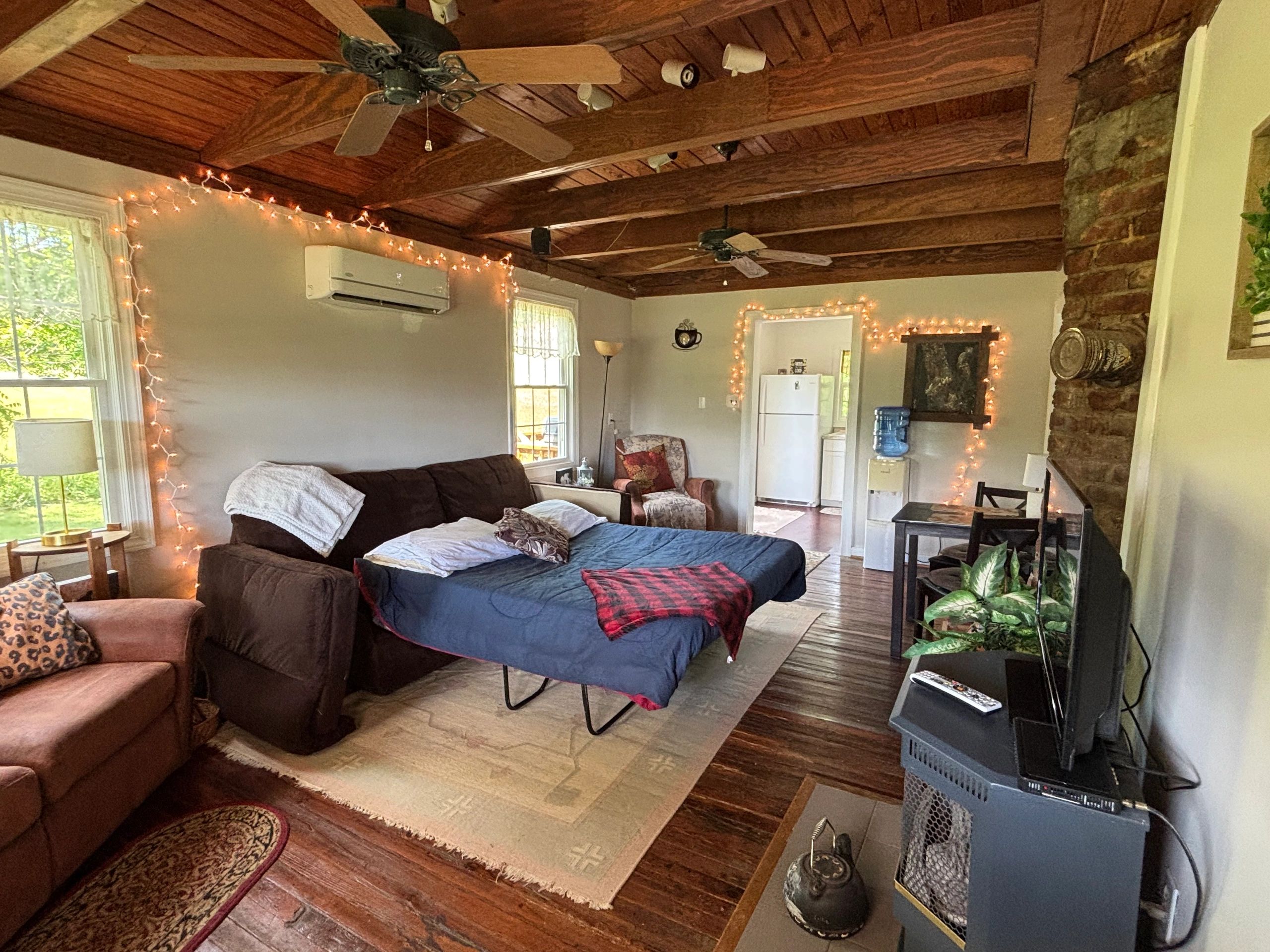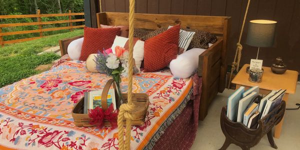 A covered Rustic Pavilion with a beautiful handmade swinging daybed for tea parties and small events